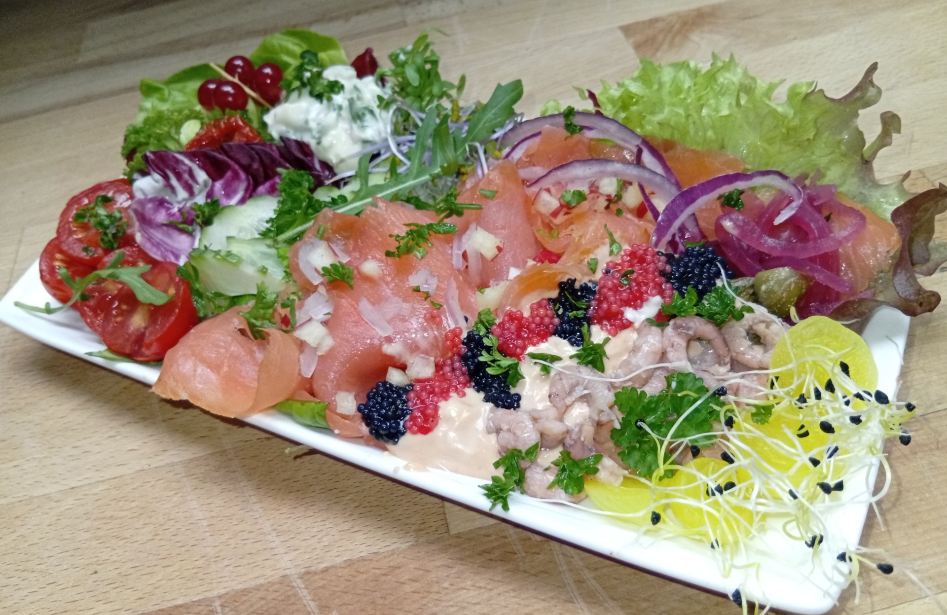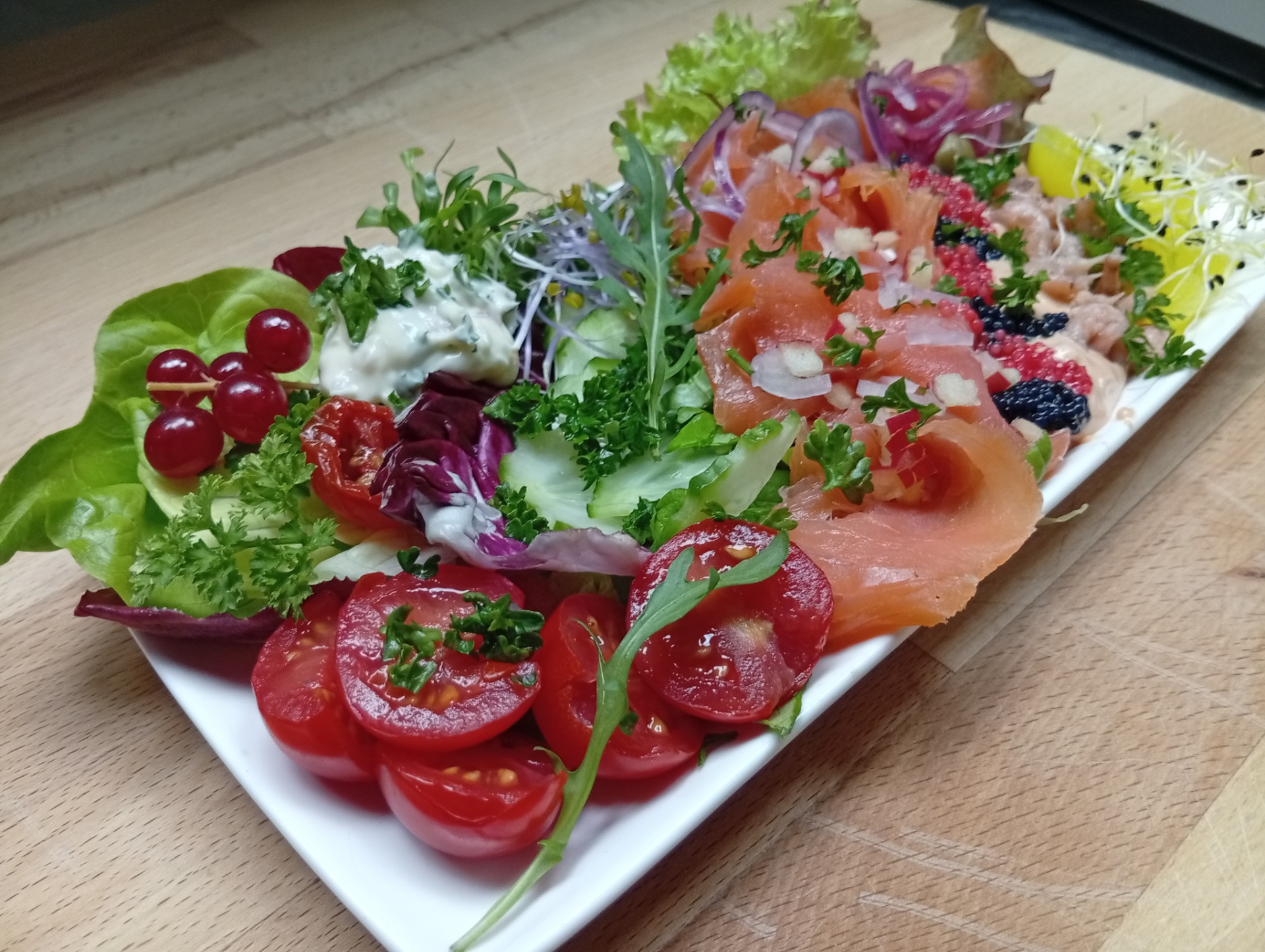 *Zalmschoteltje omringt met fris slaatje etc... en geroosterde broodjes.