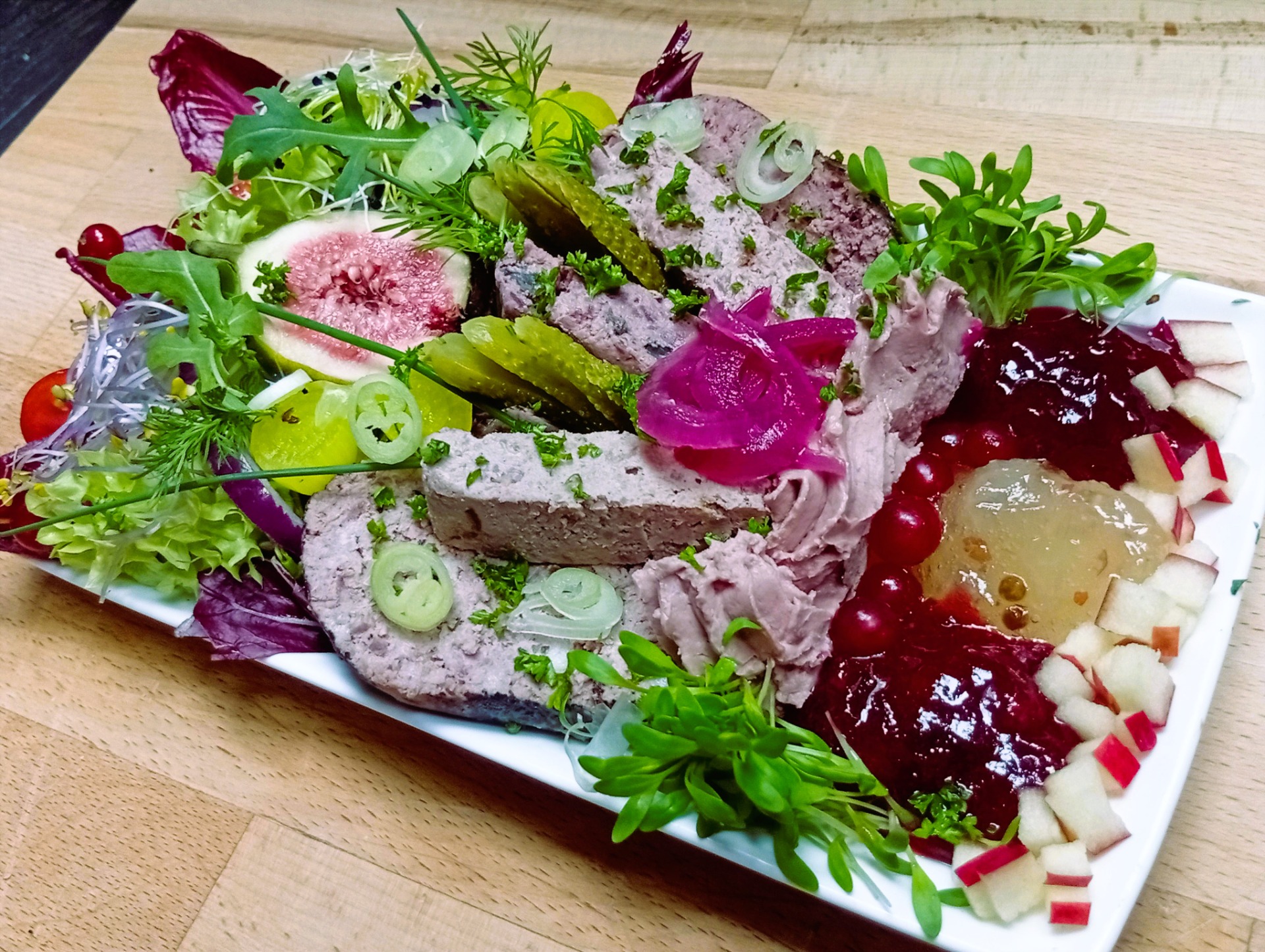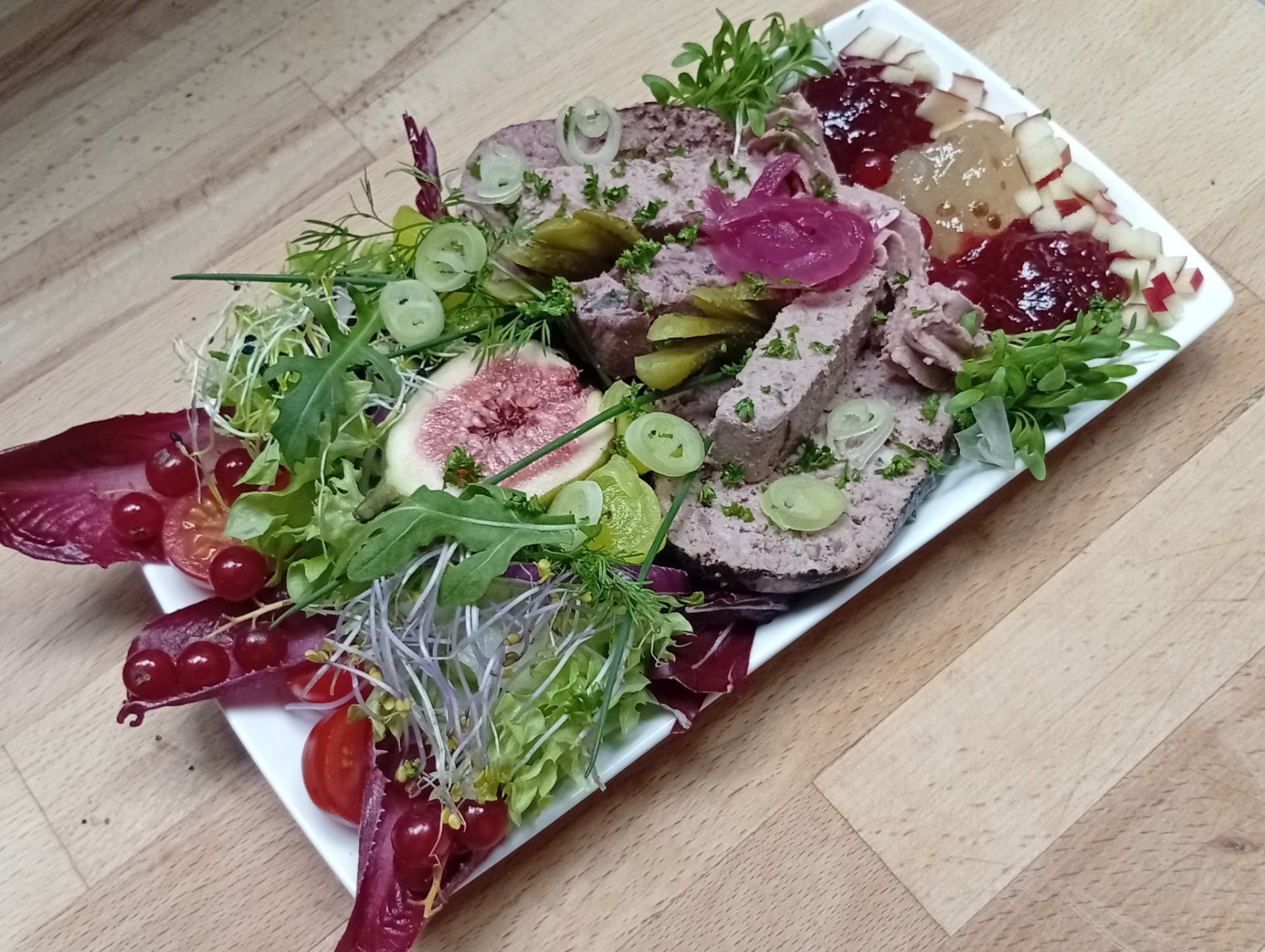 * Assortiment paté, op ass. fris slaatje, met ass. fruit / conf. en geroosterd krentenbroodjes.